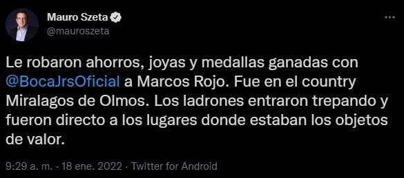 El periodista Mauro Szeta contó los detalles del caso: “Le robaron ahorros, joyas y medallas ganadas con Boca. Los ladrones entraron trepando y fueron directo a los lugares donde estaban los objetos de valor”. “Por el caso detuvieron a una empleada domestica que trabaja en su casa. Rojo y su familia descubrieron el robo cuando volvieron del estadio”, agregó.