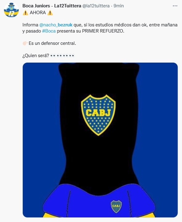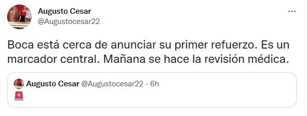 “Boca está cerca de anunciar su primer refuerzo. Es un marcador central. Mañana se hace la revisión médica”, posteó Augusto César a través de su cuenta de Twitter. Bezruk-TNT Sports-, en cambio, pone como posibilidad que el anuncio sea este martes. Se viene la primera incorporación para Ibarra en medio de un mercado de pases frío. ¿Será Barreto o hay un jugador tapado que se convierte en refuerzo?