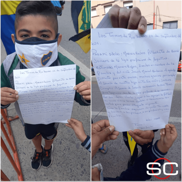 Al día siguiente, el mismo nene apareció en las afueras del hotel pero con un regalo para Marcos Rojo. Después de quedarse con su tapabocas y que la historia se haya hecho viral en redes sociales, el pequeño se tomó el tiempo de escribirle una carta a su ídolo, tal cual lo señala su mensaje. Verdaderamente emocionante.