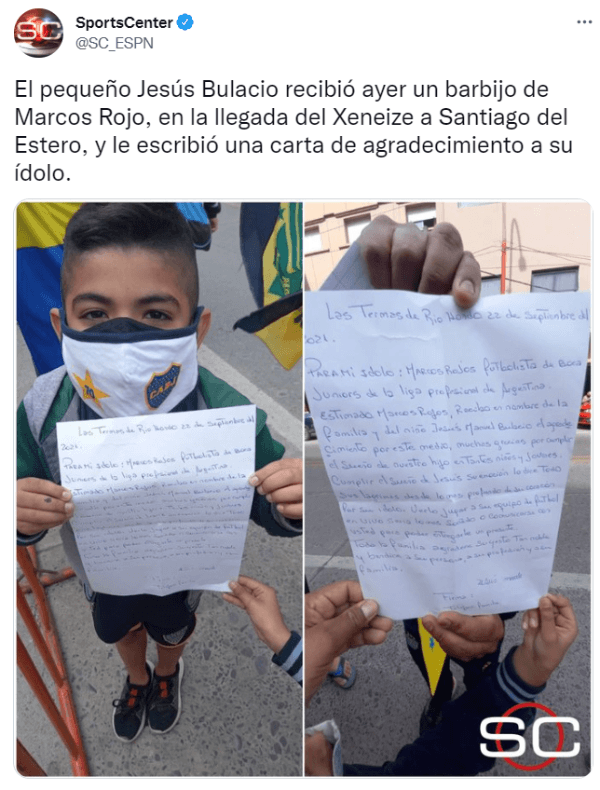 Jesús fue al hotel con el barbijo que Rojo le obsequió, para intentarle llegar su escrito después de una jornada a pura lágrima para él y su familia. “Muchas gracias por cumplir el sueño de nuestro hijo en tantos niños y jóvenes. Toda la familia agradece su gesto tan noble y bendice a su persona, a su profesión y a su familia”, escribió el entorno del pequeño hincha que vivió un momento único junto a su ídolo.