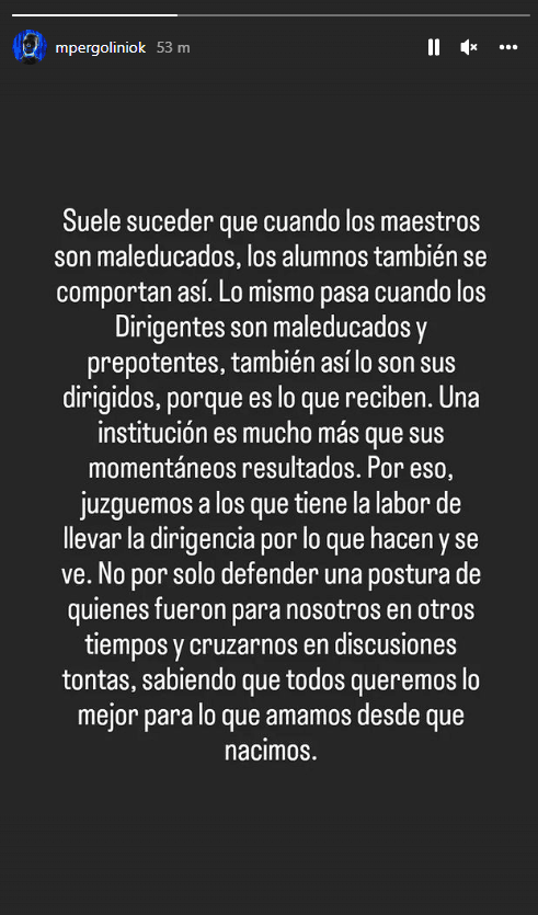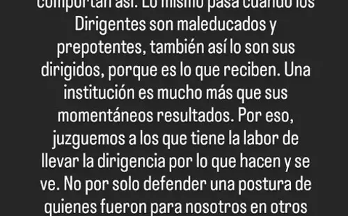 “Suele suceder que cuando los maestros son maleducados, los alumnos también se comportan así. Lo mismo pasa cuando los dirigentes son maleducados y prepotentes, también así lo son sus dirigidos”, comenzó el largo comunicado que publicó el locutor a través de sus historias de Instagram. Destinatario claro: Román, la directiva y el Consejo de Fútbol.