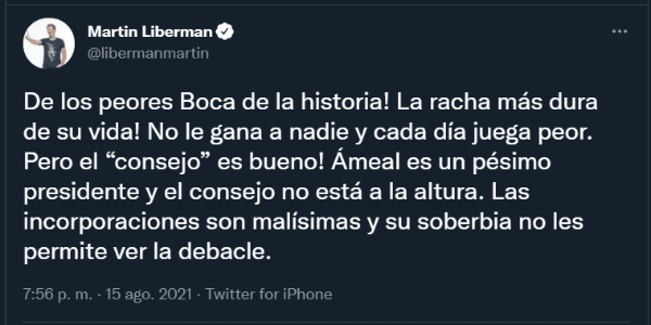 En ese contexto, quien apareció en escena para criticar de manera contundente a Boca fue Martín Liberman. El siempre picante periodista deportivo utilizó su cuenta oficial de Twitter para mostrarse extremadamente duro y filoso contra el Xeneize.