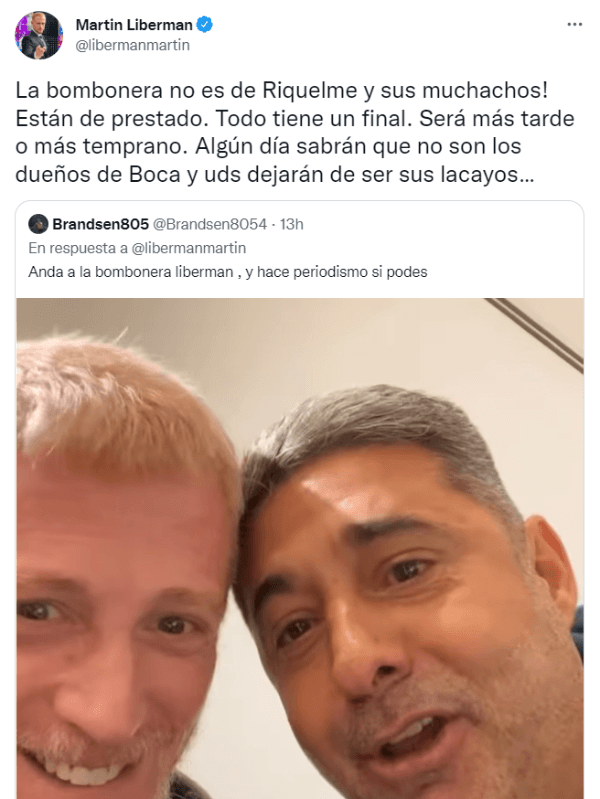 Un usuario, enojado por el posteo, atacó publicando la foto del conductor con Angelici: “Anda a la bombonera Libermany hace periodismo si podes”. La respuesta enojó al ex FOX Sports, que salió con todo apuntando a la actual dirigencia del Xeneize, especialmente a Juan Román Riquelme.