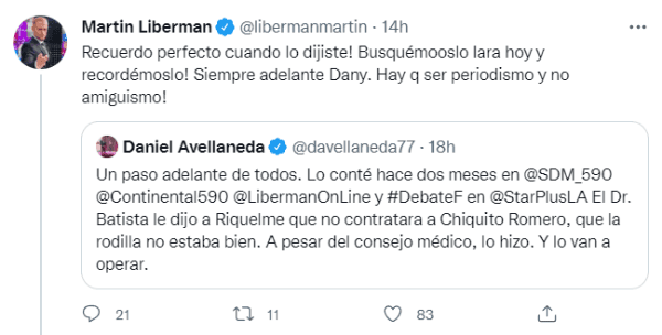 En esta oportunidad, la lesión de Sergio Romero encendió nuevamente la polémica tras conocerse que el Dr. Batista habría aconsejado anteriormente no contratar a Chiquito por sus antecedentes en la rodilla, según informó el periodista Daniel Avellaneda. “Hay que hacer periodismo y no amiguismo”, lanzó Liberman citando la información vía Twitter.