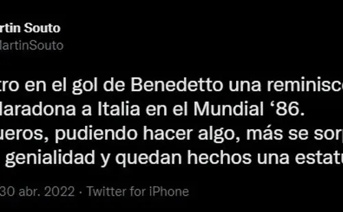 “Encuentro en el gol de Benedetto una reminiscencia al gol de Maradona a Italia en el Mundial ’86: los arqueros, pudiendo hacer algo, más se sorprenden ante tal genialidad y quedan hechos una estatua”, sostuvo Souto. El gol de Diego al que hace referencia es el del mítico toque de zurda que deja inmóvil al guardameta italiano.