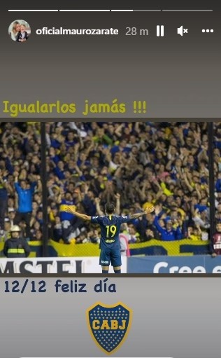 “Igualarlos jamás!!! 12/12, feliz día“, escribió Zárate en su Instagram, junto a una foto suya de espalda en La Bombonera. De fondo, toda la hinchada de Boca delirando ante un gol suyo, que lo festejó como se ve en la imagen.