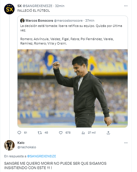 “Falleció el fútbol”, exclamó el reconocido Sangre Xeneize. Y claro que las opiniones no tardaron en llegar. “Me quiero morir, no puede ser que sigamos insistiendo con este 11”, “viajaré7 horas para ver a Ramírez trotar 90 minutos” y otras críticas pueden leerse en las redes.