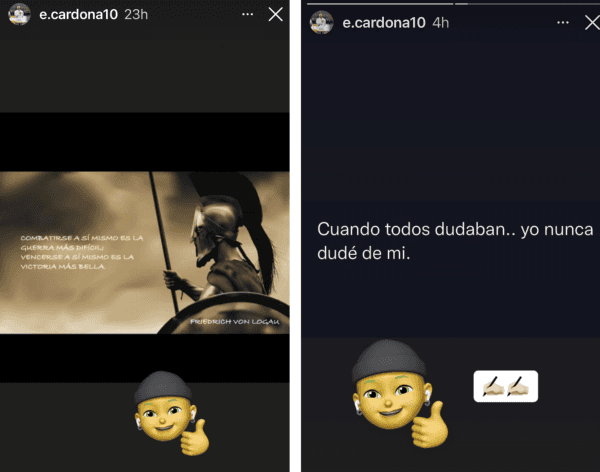 Esta mañana, tras haber visto el último encuentro desde la platea junto a Sebastián Villa y Carlos Zambrano, el ex-Atlético Nacional subió una historia con una frase llamativa. “Cuando todos dudaban, yo nunca dudé de mí”, dice el posteo, que se suma al que subió un día atrás: “Combatirse a sí mismo es la guerra más difícil; vencerse a sí mismo es la victoria más bella”.