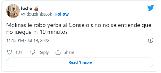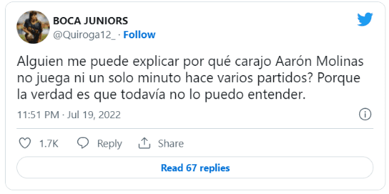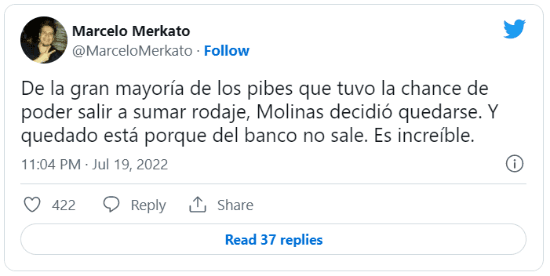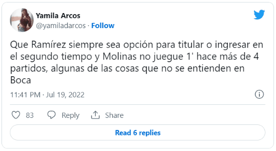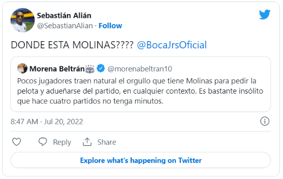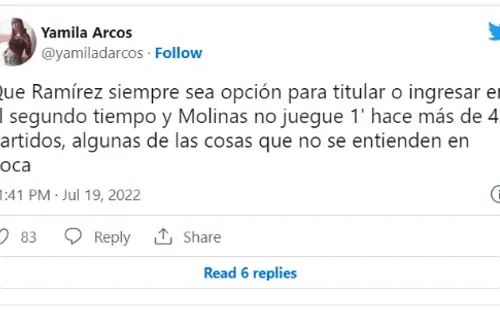 La periodista lo escribió sin filtro en su cuenta de Twitter: “Pocos jugadores traen natural el orgullo que tiene Molinas para pedir la pelota y adueñarse del partido, en cualquier contexto. Es bastante insólito que hace cuatro partidos no tenga minutos”.