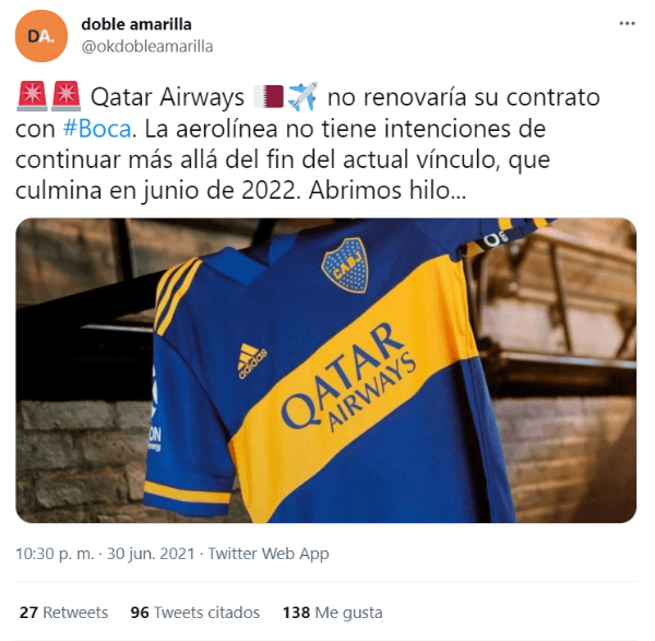 Pasa que según informó ‘Doble Amarilla’, Qatar Airways, el sponsor principal de la camiseta del ‘Xeneize’, estaría buscando romper su vínculo con el club lo antes posible, y si no es posible, en junio de 2022 cuando culmine el contrato, no lo renovarían.