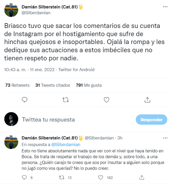 El usuario @Silberdamian alertó a sus seguidores sobre lo ocurrido mediante un reflexivo texto. “Briasco tuvo que sacar los comentarios de su cuenta de Instagram por el hostigamiento que sufre de hinchas quejosos e insoportables. Ojalá la rompa y les dedique sus actuaciones a estos imbéciles que no tienen respeto por nadie.Esto no tiene absolutamente nada que ver con el nivel que haya tenido en Boca. Se trata de respetar el trabajo de los demás y, sobre todo, a una persona. ¿Quién carajo te crees que sos por insultar a alguien solo porque no jugó como vos querías? No lo puedo creer”, escribió.