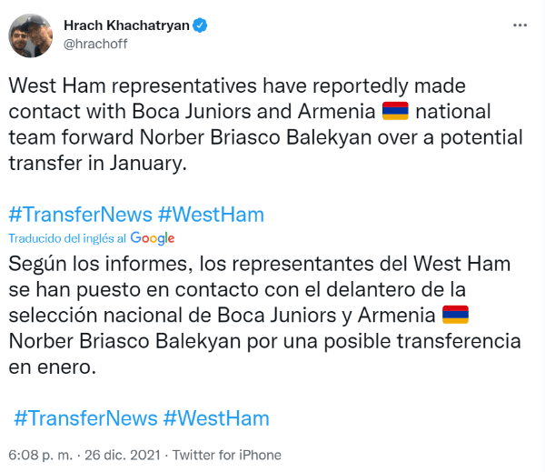 “Según los informes, los representantes del West Ham se han puesto en contacto con el delantero de la selección nacional de Boca Juniors y Armenia, Norberto Briasco Balekyan, por una posible transferencia en enero”, publicó en su cuenta de Twitter el periodista armenio Hrach Khachatryan.