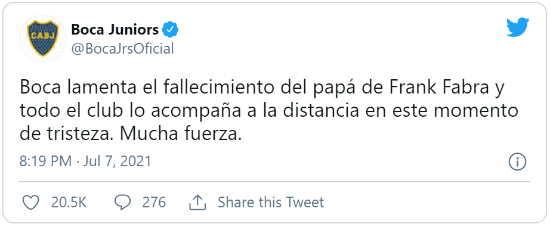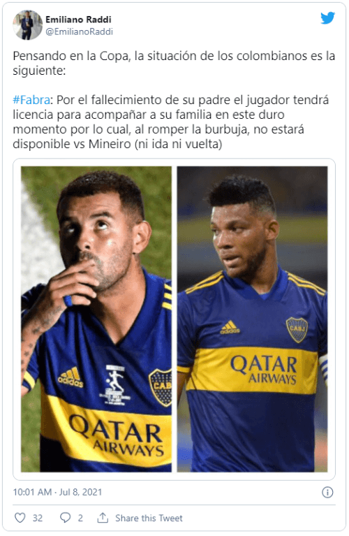 Ayer, el propio club comunicó la pésima noticia del fallecimiento del padre de Frank Fabra, que actualmente se encuentra disputando la Copa América con su selección. Una vez finalizada su participación (viernes), al lateral le otorgarán una licencia para acompañar a su familia.