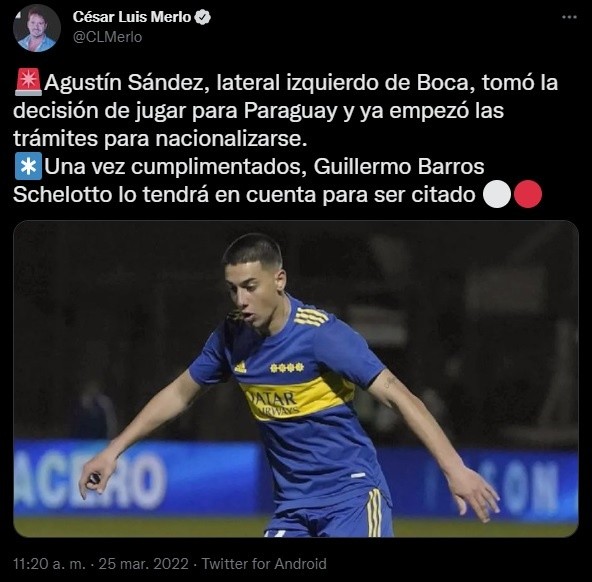 Así lo informó el periodista César Merlo: “Agustín Sández, lateral izquierdo de Boca, tomó la decisión de jugar para Paraguay y ya empezó las trámites para nacionalizarse. Una vez cumplimentados, Guillermo Barros Schelotto lo tendrá en cuenta para ser citado”.