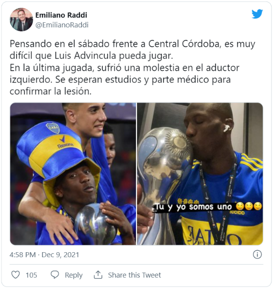 Se trata de Luis Advíncula, quien estuvo en boca de todos por el carisma que demostró luego de haber ganado la copa. El lateral derecho culminó el compromiso con una molestia en el aductor izquierdo, lo que complica su presencia ante Central Córdoba. Le harán estudios.
