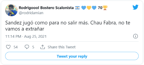 Tan bueno fue el encuentro del chico de 20 años que los hinchas de Boca se acordaron inmediatamente de Fabra. Cada buena jugada del joven provocó que varios consideren que tiene que ser el dueño del puesto de acá en adelante, por lo menos hasta que el experimentado lateral vuelva a su mejor nivel, que es de selección. En Twitter lo manifestaron luego de una gran jugada de Gusa en el primer tiempo.