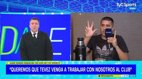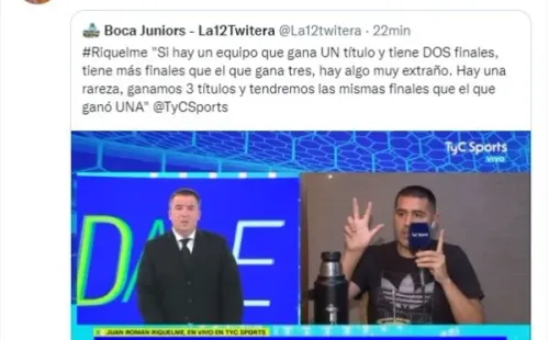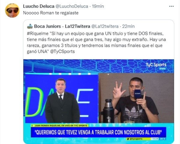 Lo curioso ocurrió en medio de la charla de Riquelme con Gastón Recondo en TyC Sports. Durante la extensa entrevista, el dirigente hablaba de las finales que debería jugar Boca por haber sido campeón con respecto a las que jugó River e hizo un gesto que lo condenó: en una mano mostró tres dedos y en la otra uno.