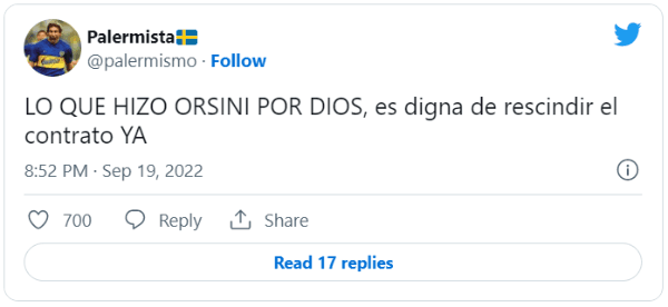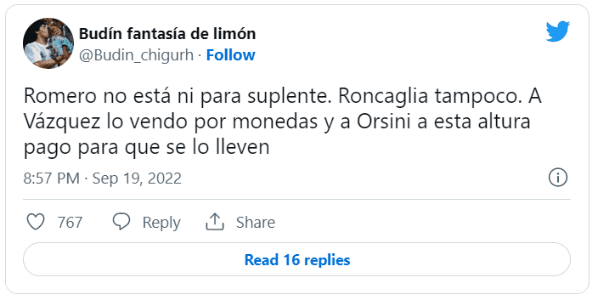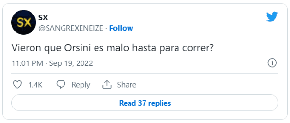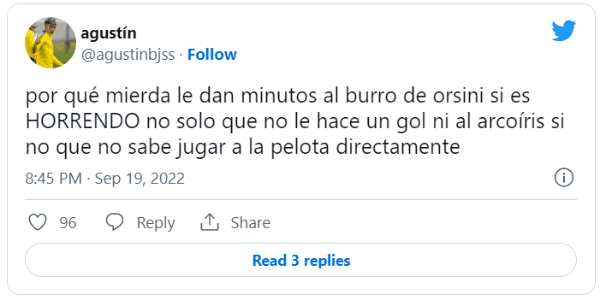 Se trata de Nicolás Orsini, quien no tuvo un buen ingreso en el complemento y no se salvó de las críticas. El delantero reemplazó a Luca Langoni a los 33′ del segundo tiempo y no pudo gravitar: no estuvo fino en los pases, perdió todos los duelos con Merolla y mostró poca ambición en una de las chances más claras del equipo.