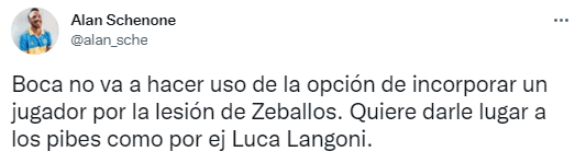 “Boca no va a hacer uso de la opción de incorporar un jugador por la lesión de Zeballos. Quiere darle lugar a los pibes como, por ejemplo,Luca Langoni”, afirmó el exconductor del canal oficial de Boca a través de sus redes sociales. Una decisión que no caerá bien en cierto sector de la hinchada, sobre todo por la capacidad económica del club y la falta de recambio que tiene Hugo Ibarra.