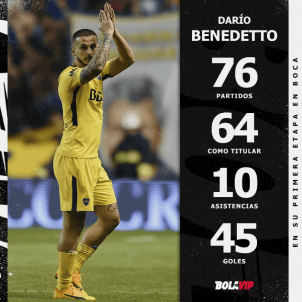 El paso de Benedetto por el Xeneize se desarrolló entre 2016 y 2019. En total, disputó 76 encuentros y participó directamente de 55 goles, aportando 45 tantos y 10 asistencias. Asimismo, cuando estuvo en cancha, participó en el 54% de los gritos del Xeneize, que fueron 102. Una verdadera locura.