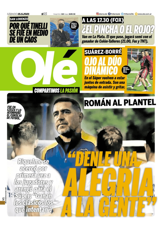 Una vez conocida la noticia, muchos empezaron a revelar detalles de esa charla entre Román y los futbolistas, y fue Olé quien se encargó de dejar la frase más importante en la tapa de este sábado 15 de mayo. “Denle una alegría a la gente”, fueron las palabras más contundentes del máximo ídolo de la historia del club.