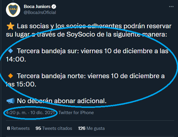 Sin embargo, allí se dio un insólito error de parte del community manager xeneize, ya que informó que los socios adherentes de Boca podían adquirir entradas a través de la página “SoySocio”, pero ¡lo informó tarde!