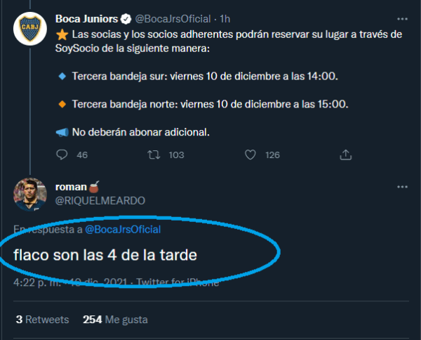 Obviamente, un reconocido hincha de Boca en Twitter -@RIQUELMEARDO- lo dejó en evidencia al escribirle como comentario: “Flaco son las 4 de la tarde“. Claro está que no fue el único que lo remarcó. ¡Particular error!
