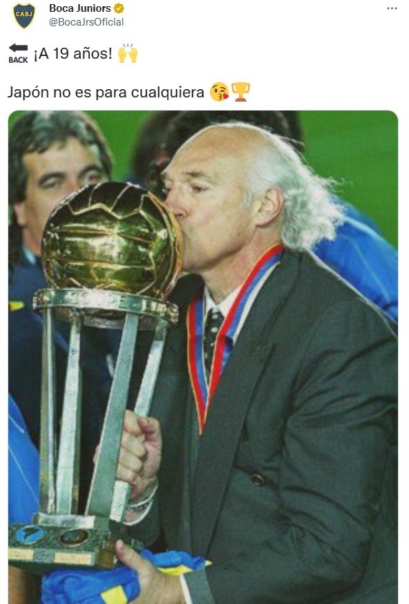 Cerca de las once y media de la mañana, el Xeneize publicó una imagen de Carlos Bianchi besando el trofeo de la Intercontinental que le arrebató al Milan (otra vez, como cuando era DT de Vélez) y dejó un palito al pie de la publicación. “A 19 años. Japón no es para cualquiera”, decía la foto que incluyó un emoji de un beso y un guiño. Picante.