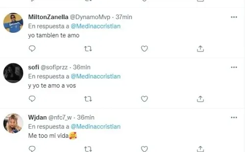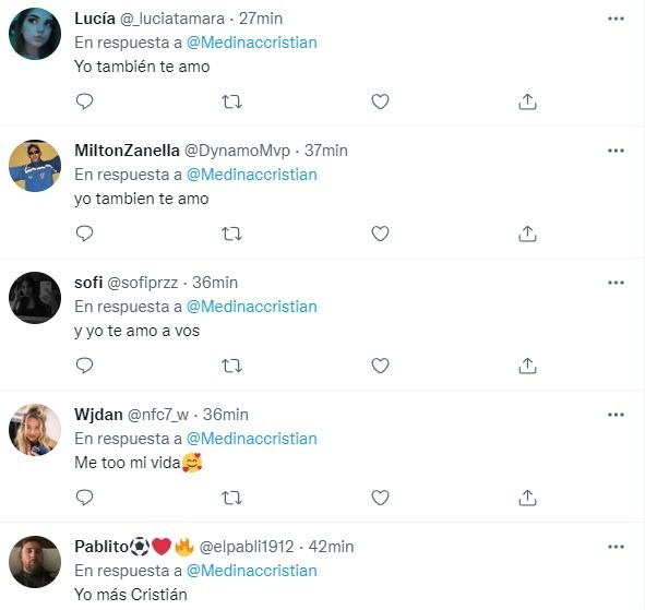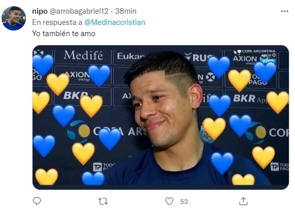 Rápidamente la publicación se llenó de respuestas de los hinchas, que jugaron a “hacerse cargo” del mensaje y le devolvieorn el afecto al mediocampista. Medina fue titular con Miguel Ángel Russo y ahora suma minutos como suplente con Battaglia, pero se perfila para ser el volante del futuro en el club.