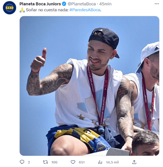 #ParedesABoca pisó fuerte entre las principales tendencias en Twitter y más de un simpatizante del Xeneize se ilusionó. Lo cierto es que no se trata ni de una oferta formal ni de una información oficial, simplemente son miles de hinchas implorando su regreso.