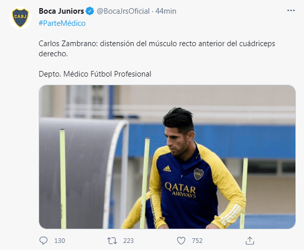 A tráves de sus redes sociales, Boca informó queCarlos Zambrano, quien perdió lugar en el campo de juego con Lisandro López primero por dar positivo de COVID-19, sufrió una lesión en el último entrenamiento que lo dejará afuera del encuentro de este sábado en elPresbítero Bartolomé Grella de Paraná, Entre Ríos.