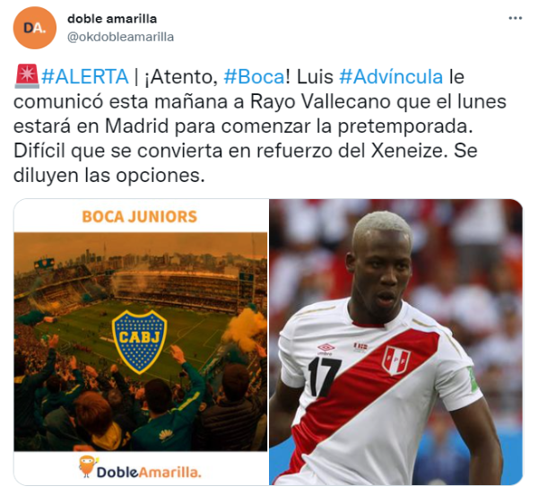 La lista final debe entregarse el sábado a las 18:00 horas y Boca batalla a contrarreloj para cerrar al menos uno de los tres nombres que más vienen sonando en el último tiempo. No obstante, una noticia sacudió al Consejo del Fútbol esta mañana. Según informó el medio Doble Amarilla, Luis Advíncula le avisó al Rayo Vallecano que se presentará a entrenar el próximo lunes y advirtieron que esdifícil que se convierta en refuerzo del Xeneize.
