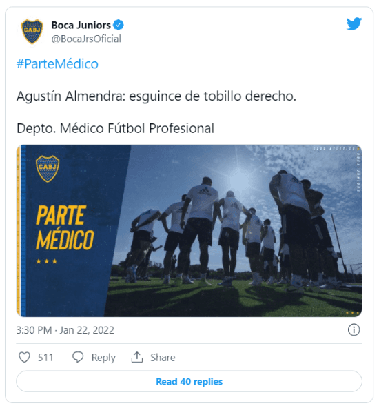 El Departamento Médico confirmó que lo de Almendra es un “esguince de tobillo derecho”, sin aclarar el grado de la lesión. Sin embargo, Olé reveló que el futbolista tendrá para entre 3 y 4 semanas de recuperación, por lo que se perderá el inicio de la próxima Copa de la Liga.