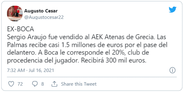 Sergio Araujo, jugador surgido en la cantera de La Ribera y con un pasado lejano en La Bombonera, fue vendido al AEK Atenas de Grecia. Las Palmas, conjunto español que contaba con sus servicios, recibirá casi un millón y medio de euros por su pase, pero un 20% deberá ir al Xeneize.
