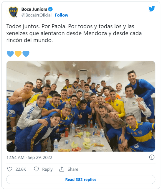 “Todos juntos. Por Paola. Por todos y todas los y las xeneizes que alentaron desde Mendoza y desde cada rincón del mundo”, escribió el club en su cuenta oficial de Twitter con la tradicional foto de todo el plantel. Sin lugar a dudas, un gran gesto de los futbolistas.
