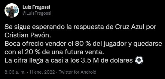 Así lo explicó el periodista Luis Fregossi: “Se sigue esperando la respuesta de Cruz Azul por Cristian Pavón. Boca ofreció vender el 80% del jugador y quedarse con el 20% de una futura venta. La cifra llega a casi a los 3.5 millones de dolares”. Ahora queda saber si desde México aprueban este detalle en el contrato.