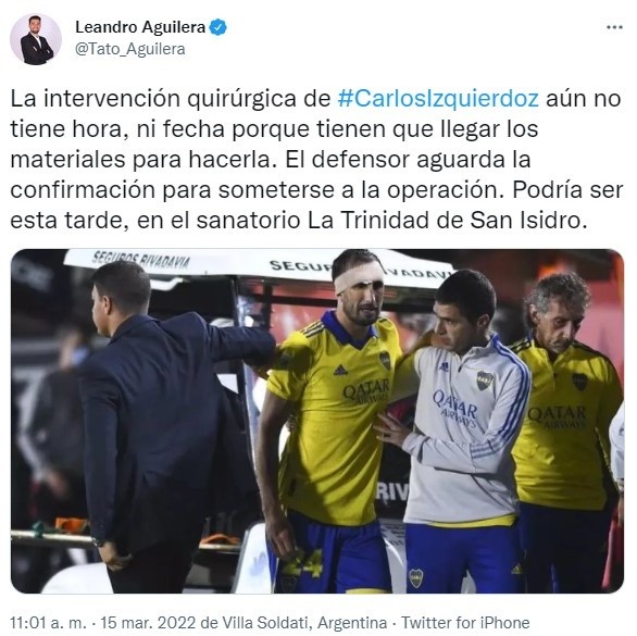 El periodista Leandro “Tato” Aguilera lo contó a través de Twitter. “La intervención quirúrgica de Carlos Izquierdoz aún no tiene hora, ni fecha porque tienen que llegar los materiales para hacerla”, aseguró.