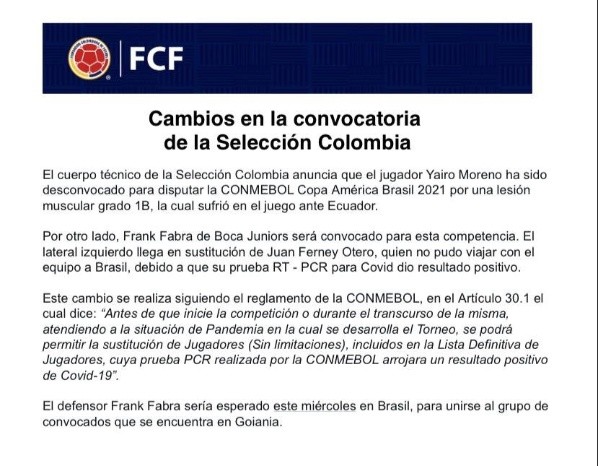 Hace pocos días, Conmebol había anunciado que la posibilidad de reemplazar futbolistas por COVID-19 y lesiones no iba a tener límite, por lo que se puede realizar de manera ilimitada. En Colombia, Yairo Moreno sufrió una lesión muscular, por lo que Reinaldo Rueda le pegó un llamado a un titular del Xeneize.