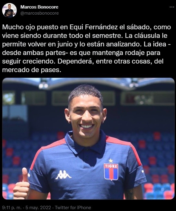 “Mucho ojo puesto en Equi Fernández el sábado, como viene siendo durante todo el semestre. La cláusula le permite volver en junio y lo están analizando. La idea -desde ambas partes- es que mantenga rodaje para seguir creciendo. Dependerá, entre otras cosas, del mercado de pases”, manifestó el cronista. Si Boca pierde alguna figura en el medio y no tiene opciones interesantes, la vuelta de Equi será casi un hecho.