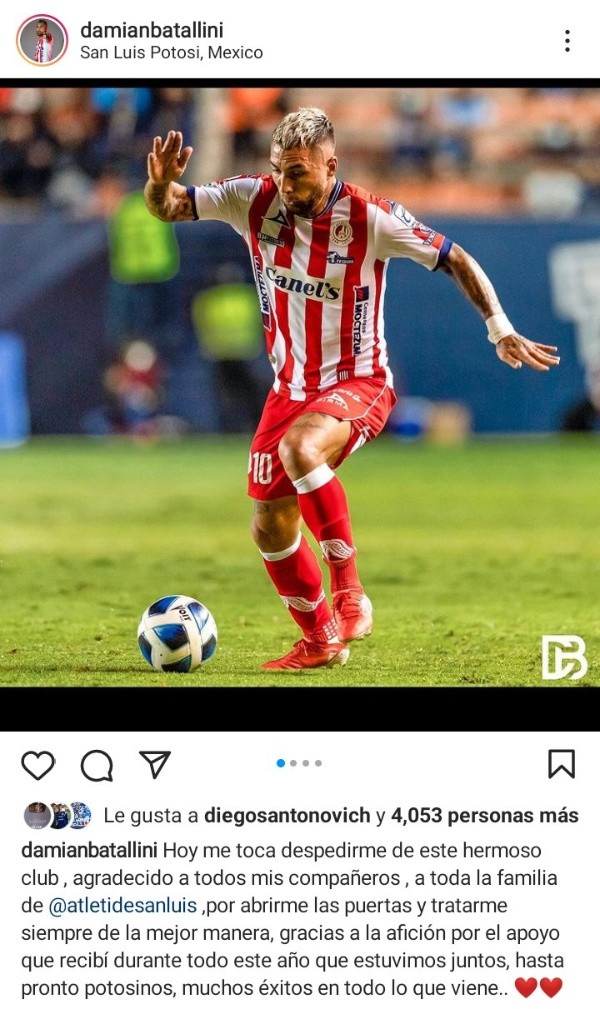A través de su cuenta de Instagram, Batallini se despidió de los hinchas de Atlético San Luis, a quienes les agradeció “por el apoyo que recibí durante todo este año que estuvimos juntos. Hasta pronto potosinos, muchos éxitos en todo lo que viene”.