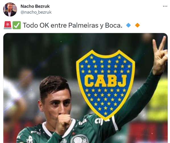 Mediante su cuenta de Twitter, el periodista Ignacio Bezruk confirmó la operación entre los clubes. Pero la gran sorpresa se conoció desde las tierras paulistas: diversos medios partidarios de Palmeiras aseguran que el monto que abonará el Xeneize por el préstamo es de 500 mil dólares y la opción de compra será de 3 millones de la moneda estadounidense.