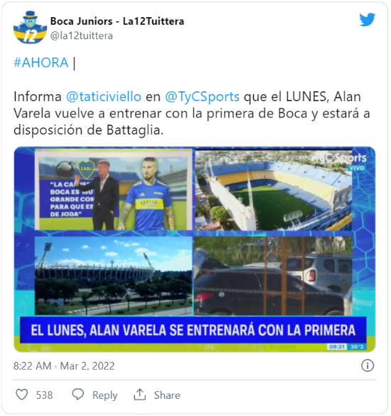 Cuando la noticia de la discusión entre Sebastián Battaglia y Agustín Almendra sacudía al Mundo Boca, empezaba a llamar la atención la ausencia de Alan Varela en la práctica de fútbol. Tras algunos falsos rumores de una lesión, se confirmó que el mediocampista fue castigado por un acto de indisciplina y desde entonces se entrena con la Reserva de Hugo Ibarra.