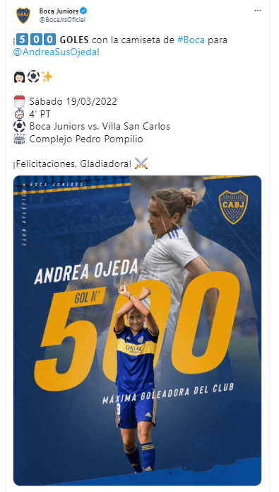 La 9 de Boca tiene números sorprendentes. Gracias a su tanto de este sábado por la tarde ante Villa San Carlos, Ojeda llegó ¡a los 500 goles con la Azul y Oro! Y sí, es la máxima artillera de la historia de la institución. “Tramitá la estatua”, “Merece un reconocimiento como ídola” y otros comentarios hacen pensar a los dirigentes. Al fin y al cabo, el club es del socio…