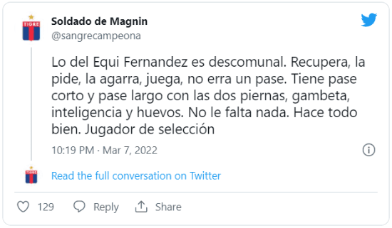 Se trata de Ezequiel Fernández, el volante central que está a préstamo en Tigre. El Equi fue uno de los puntos más destacados del club de Victoria en la victoria 1 a 0 ante Colón de Santa Fe. Fue elogiado por los hinchas del Xeneize, del Matador ¡y hasta de River!