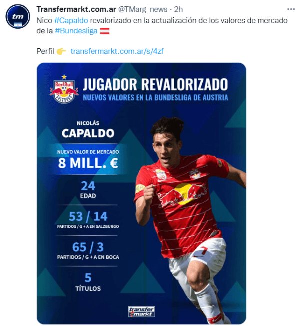 El volante se fue de Boca sin pena ni gloria, señalado por la mayoría de los hinchas por un insólito errado en un Superclásico de Copa Libertadores en el Monumental, pero la realidad lo encuentra en buenas condiciones en el fútbol austríaco. Según la nueva actualización de Transfermarkt, página especializada en valores de mercado, Capaldo fue revaluado y ascendió a los 15 primeros puestos de su liga.