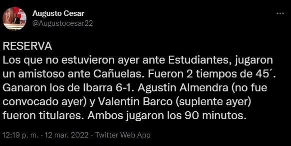 Después de algunas semanas, Agustín Almendra y Valentín Barco volvieron a jugar con la camiseta de Boca. Tras la victoria de la Reserva el viernes ante Estudiantes, el sábado los que no participaron de ese encuentro se enfrentaron a Cañuelas y lo golearon por 6-1. Y las dos figuras de juveniles estuvieron presentes.