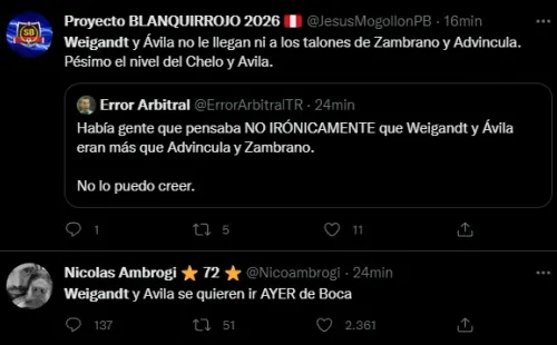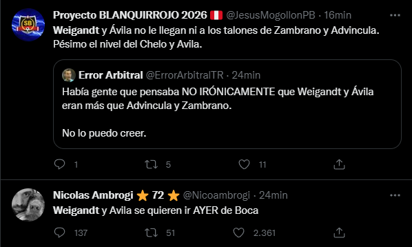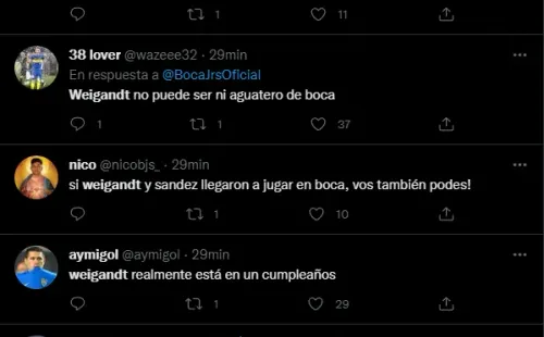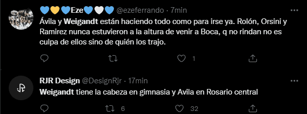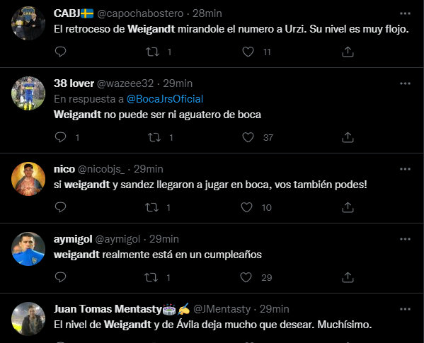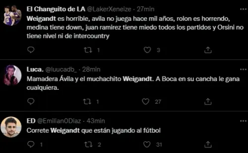 En lo que fue este flojísimo partido de Boca en líneas generales, los hinchas del Xeneize se manifestaron hacia los malos rendimientos individuales de varios de los futbolistas. Desde experimentados como Nicolás Orsini, Juan Ramírezy Esteban Rolón, hasta juveniles como Gastón Ávila y Marcelo Weigandt. Con este útlimo, es con el que fueron más duros debido a sus últimos encuentros en sí, en los que el Chelo no logra encontrarle la vuelta al equipo y no tiene buenos minutos hace tiempo.