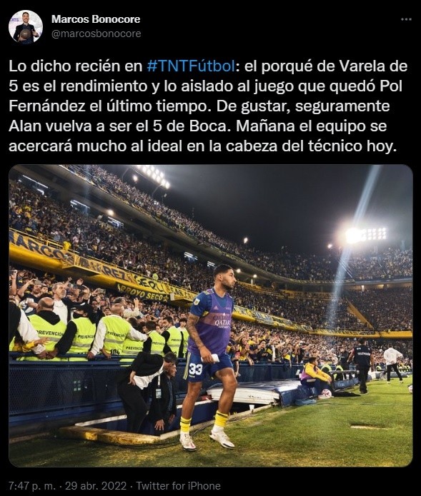 Según reveló el periodista Marcos Bonocore, el cambio tiene que ver con “el rendimiento y lo aislado al juego que quedó Pol Fernández en el último tiempo”. “De gustar, seguramente Alan vuelva a ser el 5 de Boca. Este sábado el equipo acercará al ideal en la cabeza del técnico hoy”, agregó. ¿Le saldrá bien la apuesta a Battaglia?