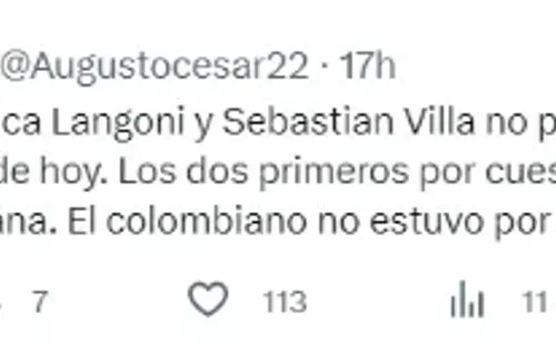 “Nicolas Figal, Luca Langoni y Sebastian Villa no participaron del entrenamiento de hoy. Los dos primeros por cuestiones físicas que serán evaluadas mañana. El colombiano no estuvo por temas judiciales”, escribió el corrresponsal del Xeneize.