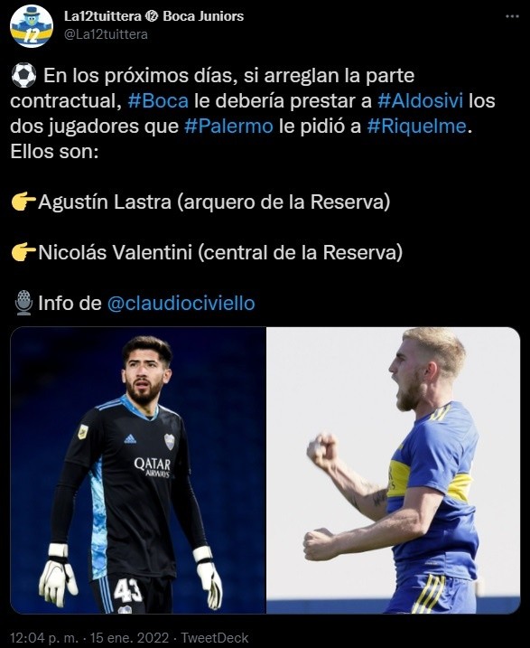 Según contó el periodista Claudio Civiello, el primero de ellos es Agustín Lastra, arquero de la Reserva que se entrena con la Primera desde hace tiempo. De hecho, formó parte de los dos partidos ante Banfield y San Lorenzo que los juveniles disputaron cuando el plantel profesional estaba aislado. El otro es Nicolás Valentini, defensor central que debutó en mayo de 2021 ante Patronato. Sin lugar en la Primera, ambos serán dirigidos por otro ídolo de Boca.